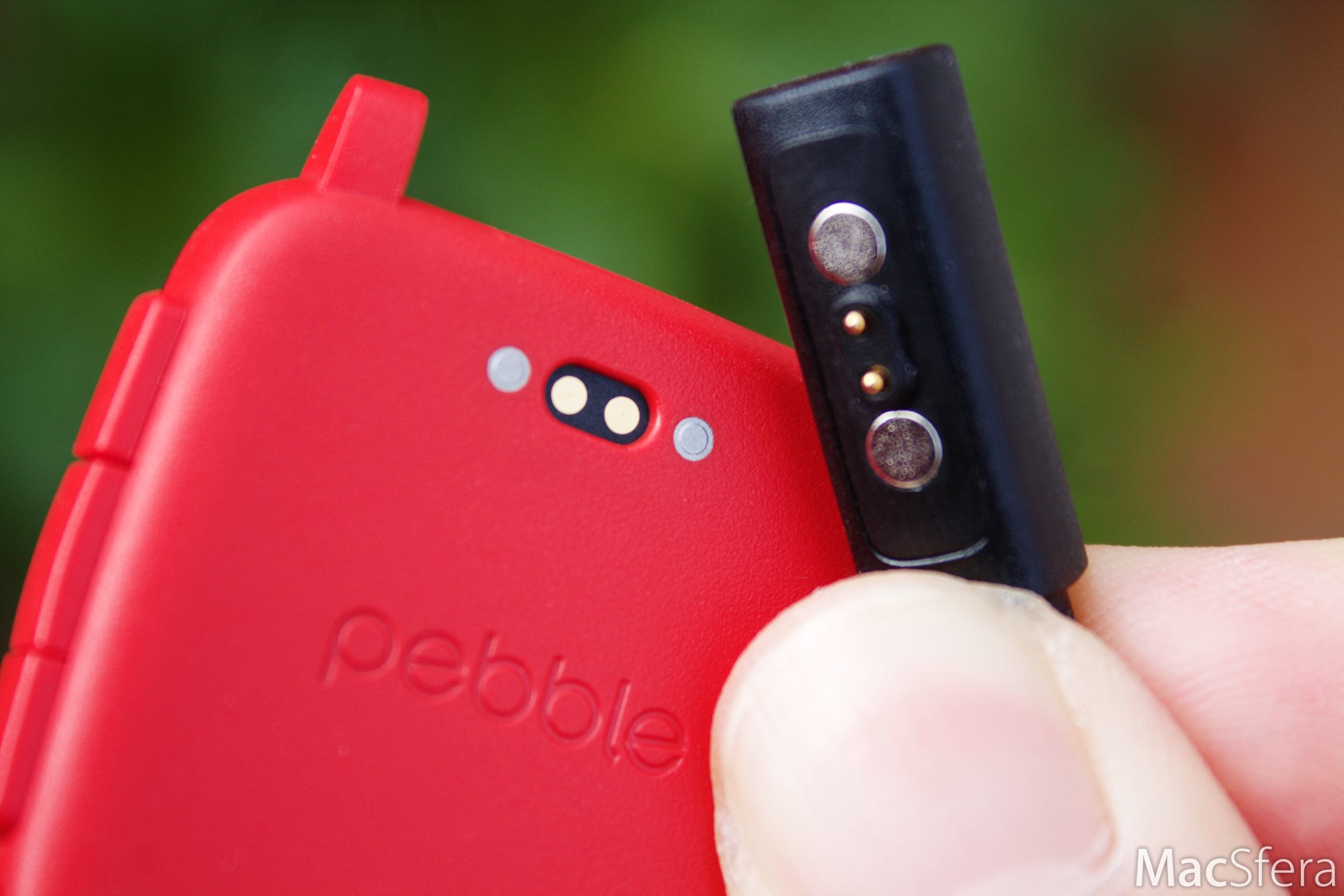 El cargador es de tipo magnético y se encuentra en la parte trasera del reloj (en vez de en el lateral como en el Pebble original). Esto nos obliga a tener que quitarnos el reloj para cargarlo, pero gracias a eso, el cuerpo del dispositivo es más fino. Si por curiosidad os preguntáis porqué es magnético, lo hacen para que el Pebble se pueda sumergir en el agua.