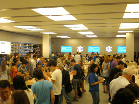 La tienda está genial, es rectangular, según se entra a la derecha está la sección de los iPods, a la izquierda Mac, en frente iPhone, la mitad izquierda de la tienda tiene más Mac y en en lado opuesto se hayan los iPad, tanto 3G como WiFi, al fondo del todo está la Genius Bar y en las esquinas del fondo se haya software para Mac, todo tipo de complementos tanto para iPhone, iPod, iPad y Mac.
